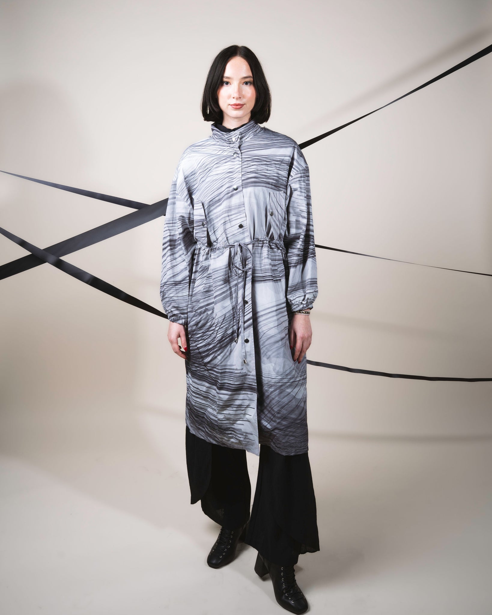 A study in motion and shadow - the Storm Sketch Raincoat captures the poetry of rain before it falls. Rendered in translucent smoky greys, graphite tones, and whisper-soft silvers, its surface reveals an abstract pattern that feels hand-drawn by the wind itself. High technology wrinkle resistant, waterproof coated-shell. The fishtail hem is slightly longer at the back for additional coverage. Fits all the sizes between UK 6 and UK 24. The relaxed fit can be tempered with drawstrings at the waist. The detachable hood is generously sized to keep you dry. Concealed snap fastenings through front. Perfect outerwear for layering.