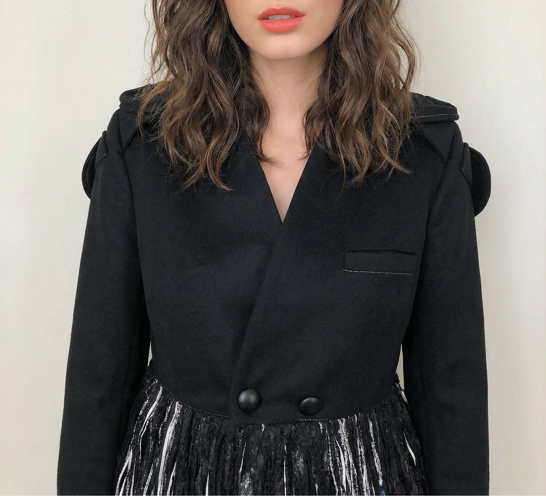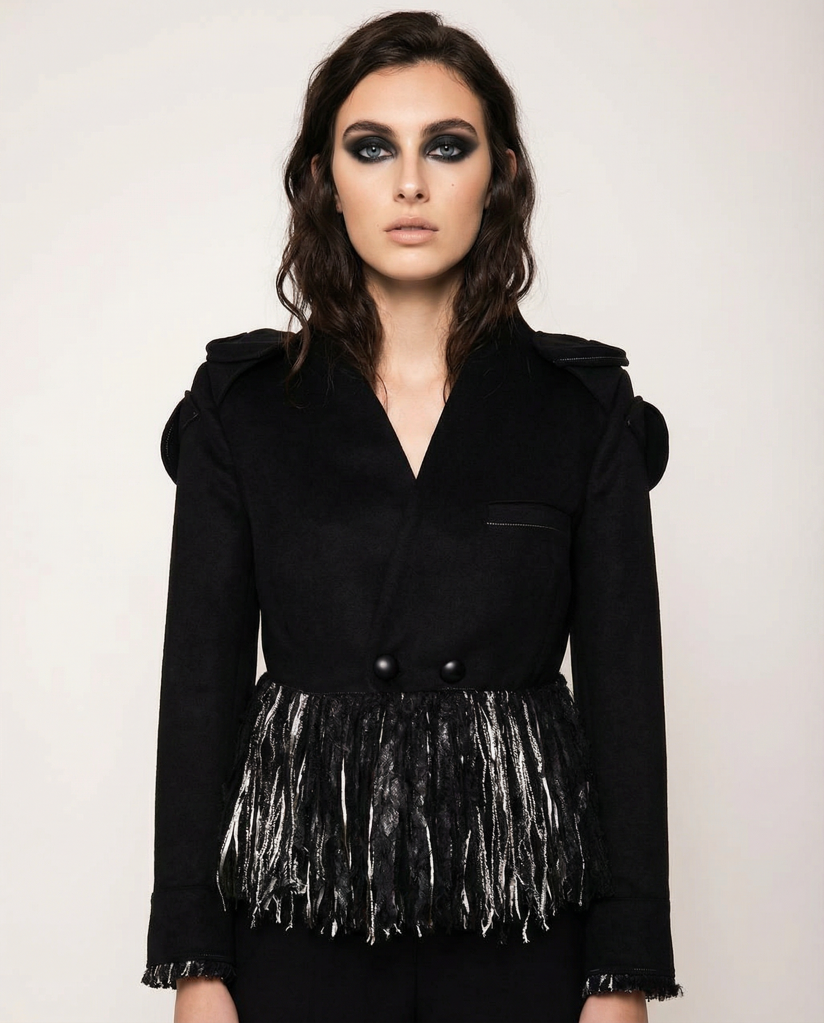 Open Rhythms Jacket is beautifully detailed and trimmed with a unique textile that will draw attention and make a statement. Special weaving and jacquard technique. Fully lined.