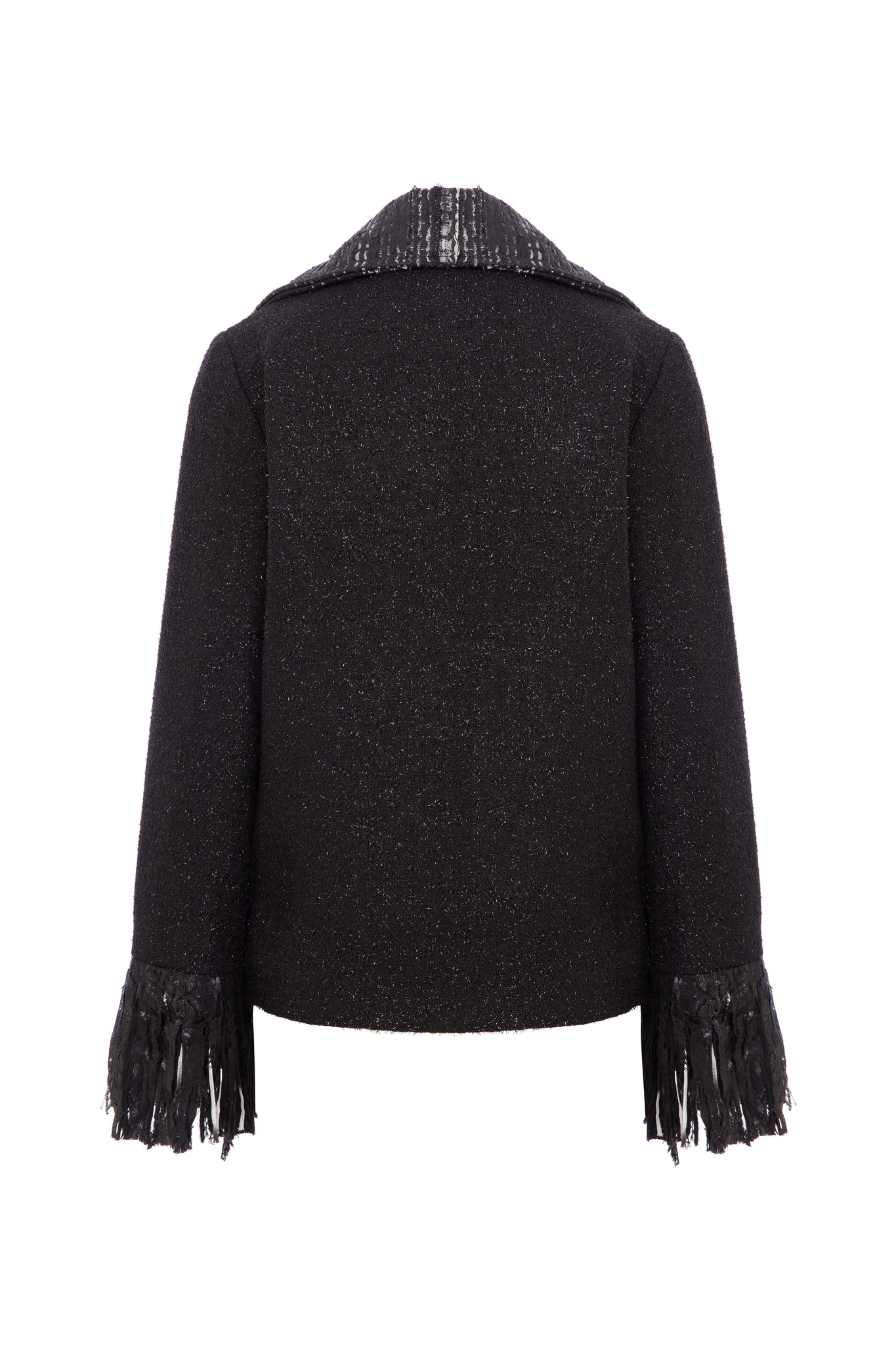 Crossing the border between Biker Jacket and Coat, Rhea Jacket is beautifully detailed and trimmed with a unique textile that will draw attention and make a statement. Special weaving and jacquard technique. Unlined. Off-centre front fastening. Perfect for office chic or weekend outings. Elevate your style with this iconic tweed jacket that seamlessly blends tradition with contemporary fashion.