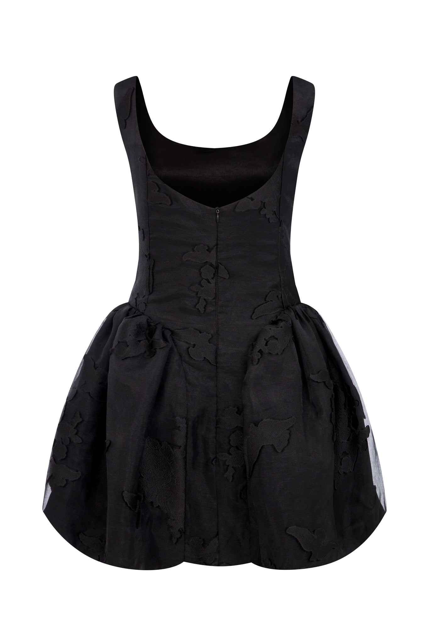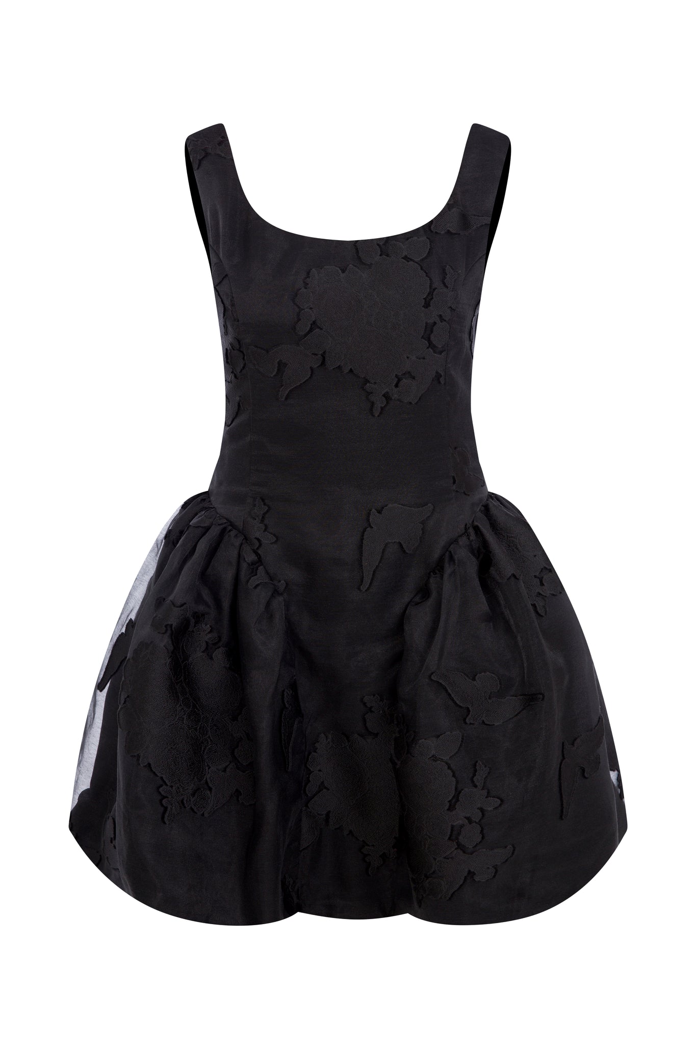 The Caroline Dress is a sculptural, statement mini crafted in rich black organza brocade emboss couture fabric, adorned with intricate tonal jacquard motifs that create a subtle yet captivating play of light and texture. Designed with a clean, sleeveless bodice and a soft mid-scoop neckline, it shapes an elegant, structured silhouette through the torso.