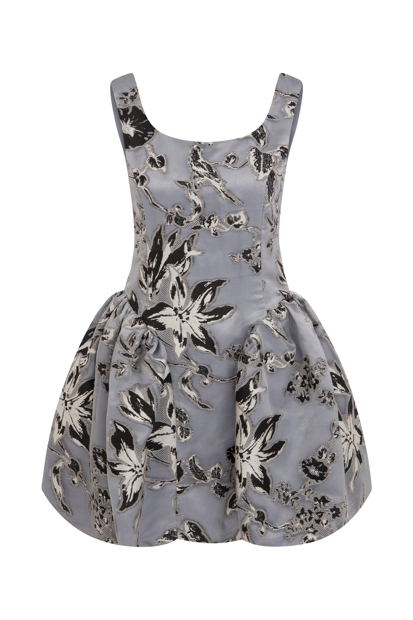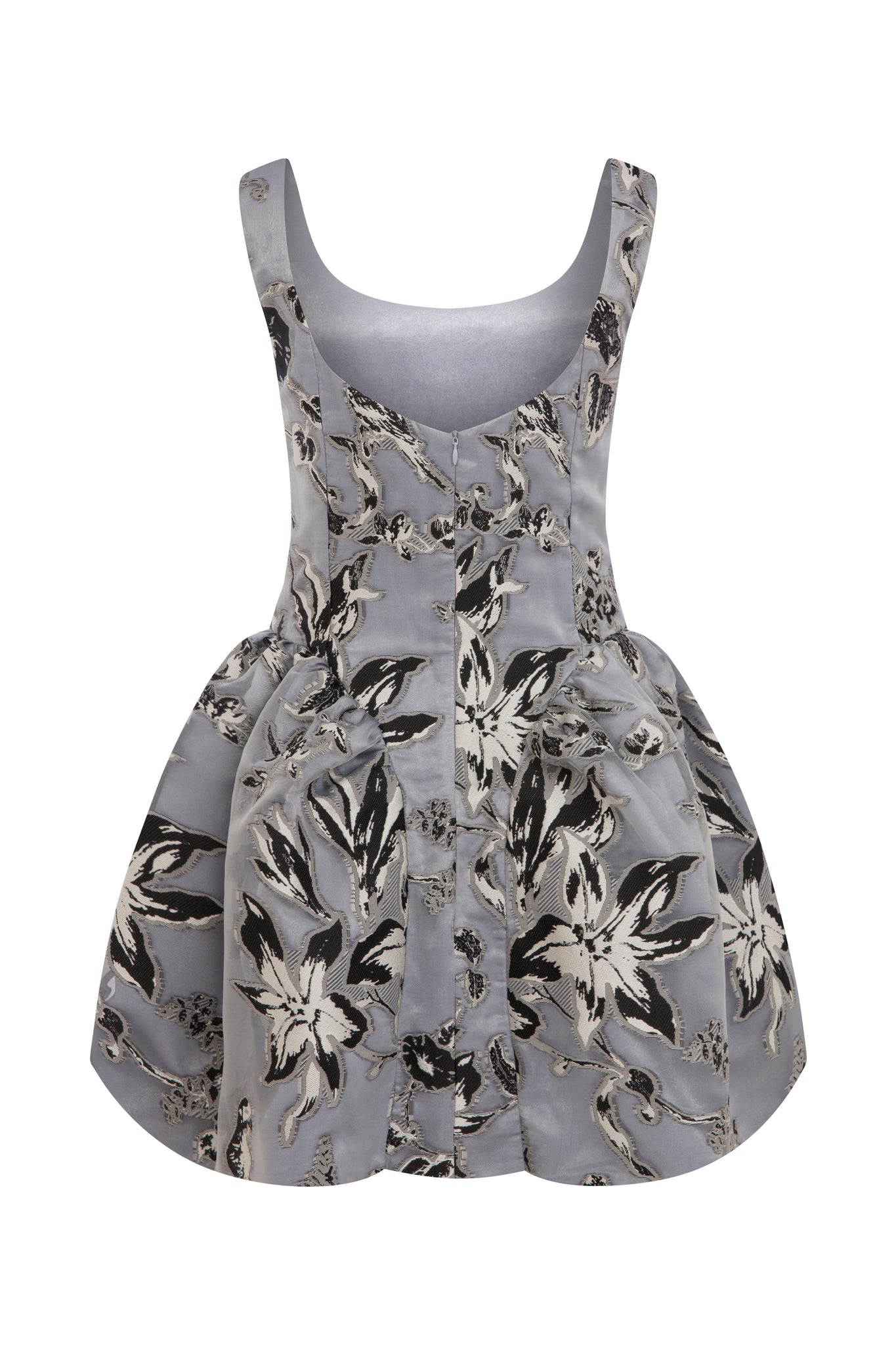 The Elena Dress is a sculptural statement mini crafted from rich metallic grey organza brocade, elevated with white-and-black embossed couture detailing. Intricate tonal jacquard motifs create a captivating interplay of light and texture across the surface. The clean, sleeveless bodice is finished with a soft mid-scoop neckline, shaping an elegant and subtly structured silhouette through the torso.