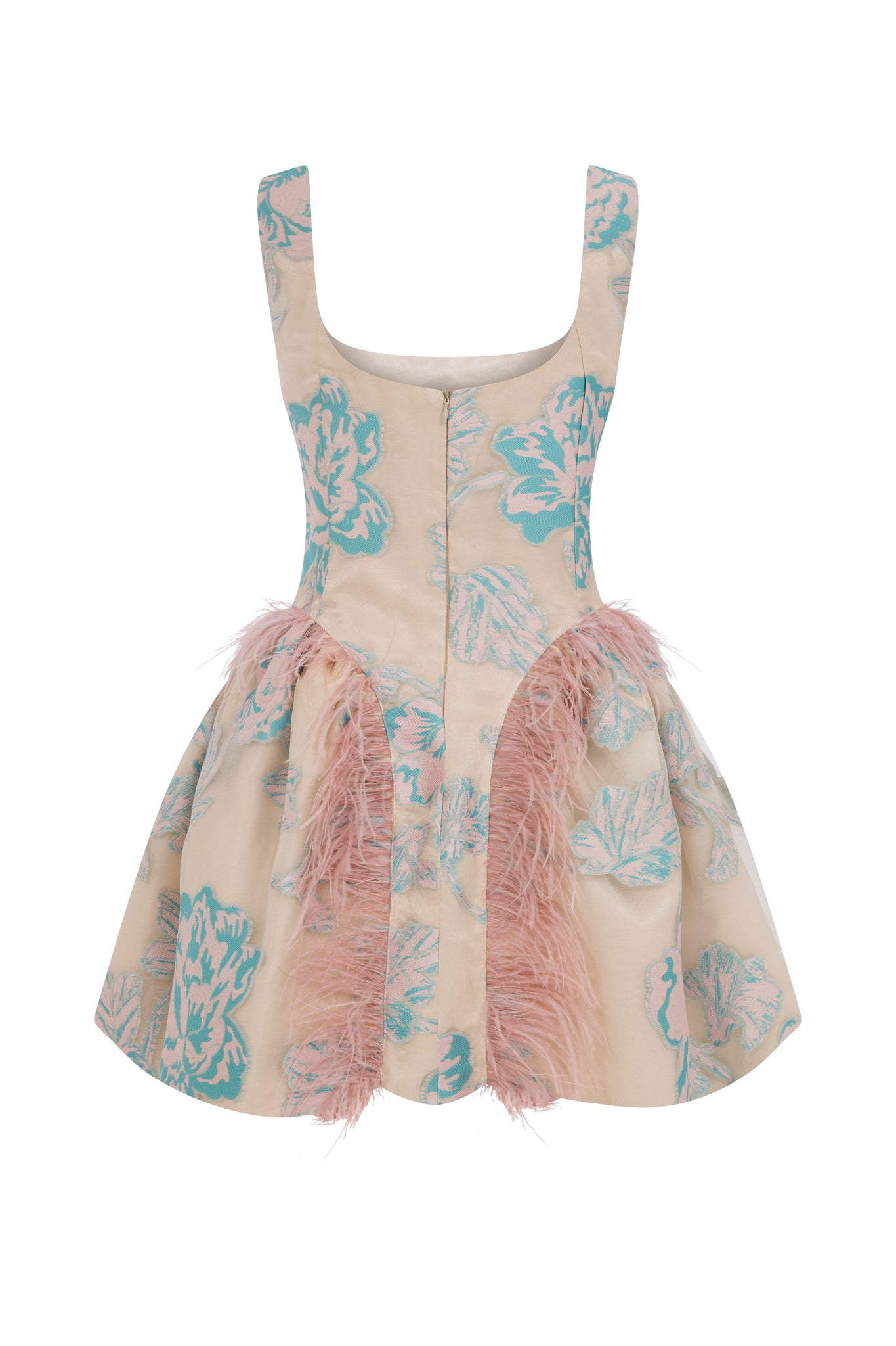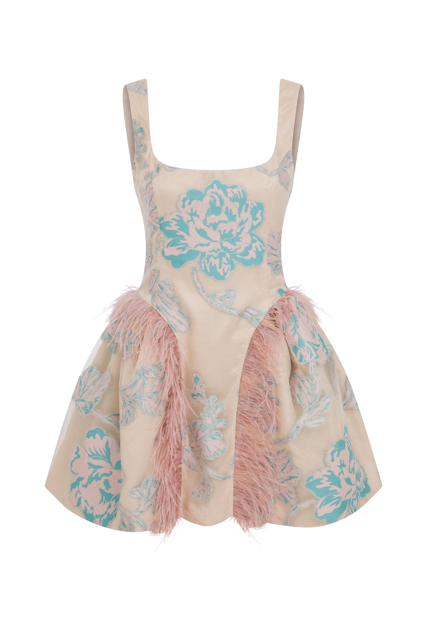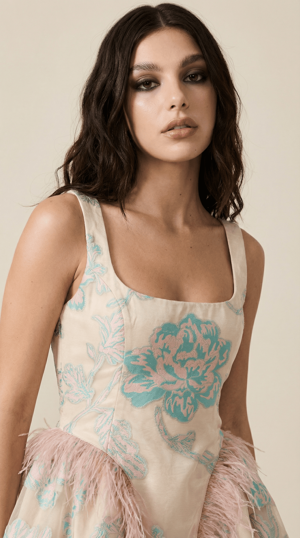 The Juliette Dress is a striking mini silhouette crafted from a luxurious combination of devoré organza and couture-grade brocade embossing. Presented in a soft champagne base enriched with bold turquoise floral jacquard and blush-pink feather accents, the colour palette brings a fresh, modern vibrancy to its sculptural form. The jacquard organza lamé fabric creates a rich interplay of texture and light, while the vivid floral motifs add depth and dimension to the piece.