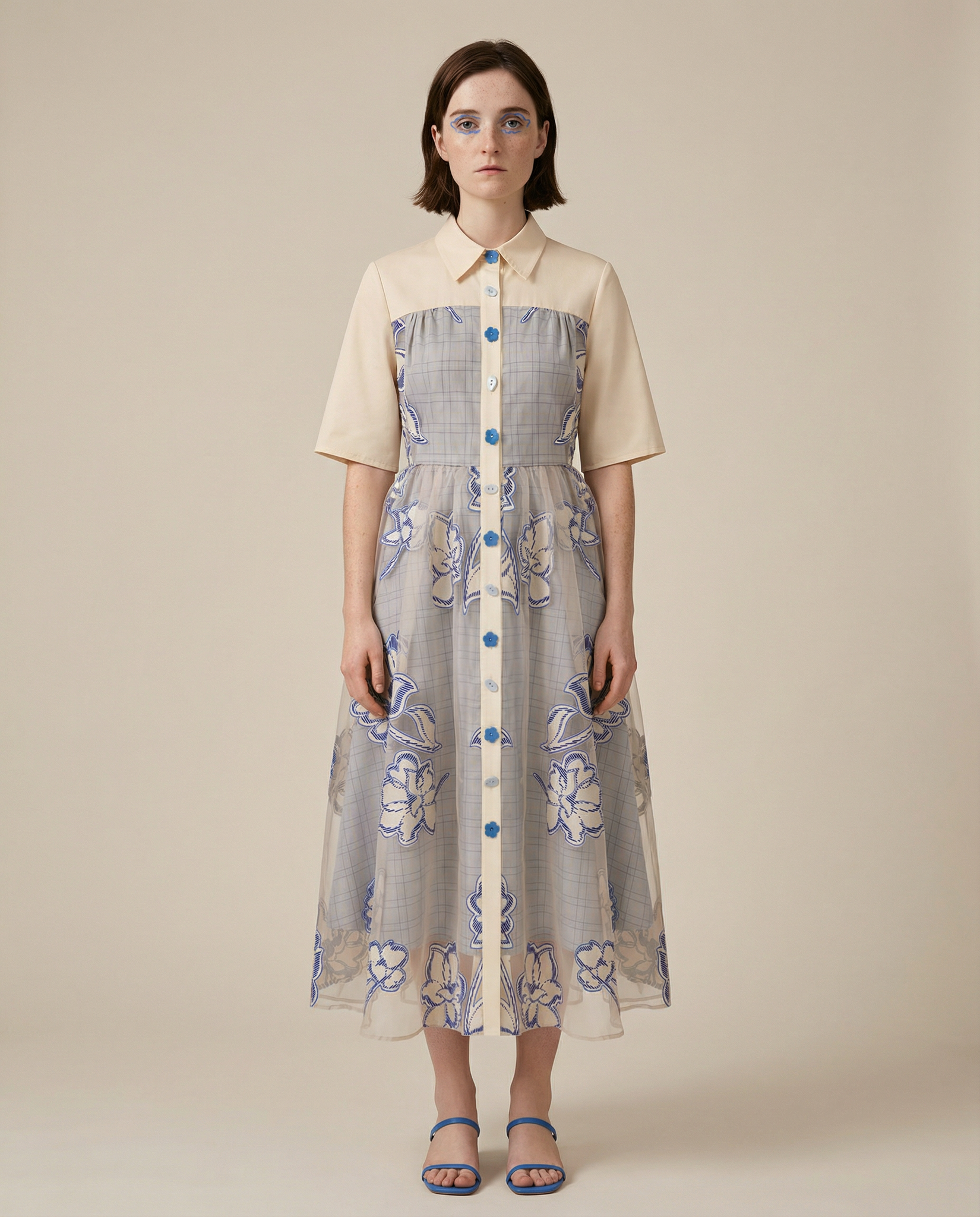 Adorned with a stunning abstract hand printed devoré fabric pattern and playful handmade buttons, it exudes sophistication and adds a touch of fun to any summer look. The long maxi shirt dress style with short sleeves makes it effortlessly stylish.