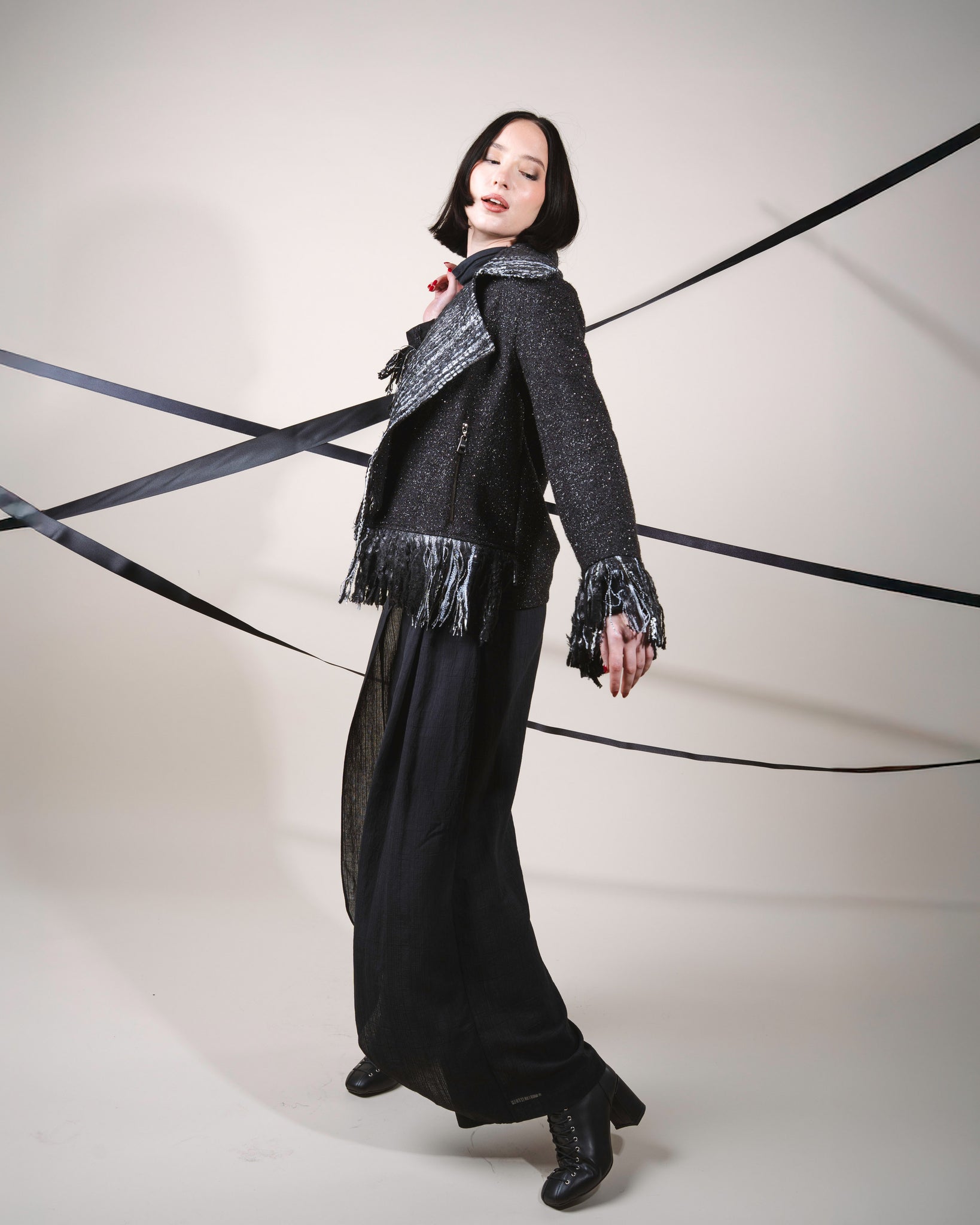 Crossing the border between Biker Jacket and Coat, Rhea Jacket is beautifully detailed and trimmed with a unique textile that will draw attention and make a statement. Special weaving and jacquard technique. Unlined. Off-centre front fastening. Perfect for office chic or weekend outings. Elevate your style with this iconic tweed jacket that seamlessly blends tradition with contemporary fashion.