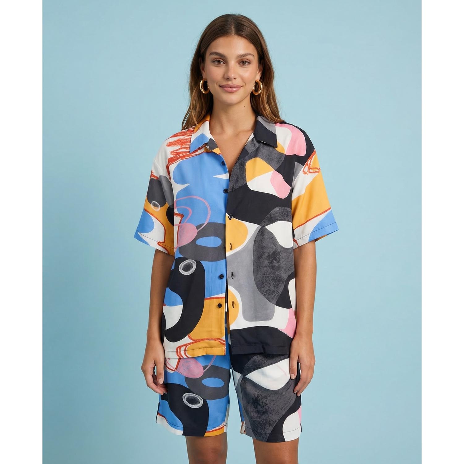 Unisex Sunotami Shirt is a versatile, simplistic yet eye catching statement piece that can be worn as a relaxed casual shirt or as a shirt dress. The print is an original gouache painting of Conxi Sane. Her art is often described as an exploration of the subconscious. With inspiration from the schools of Surrealism and Cubism and artists such as Pablo Picasso and Joan Miró, Conxi Sane has found her unique expression and creates beautiful geometrical worlds built by abstract shapes and vivid colours. Her deep appreciation of music, especially Latin Jazz, plays an important part in the work and stimulates her process of creation.The silk touch viscose material has a luxurious and beautiful feel.