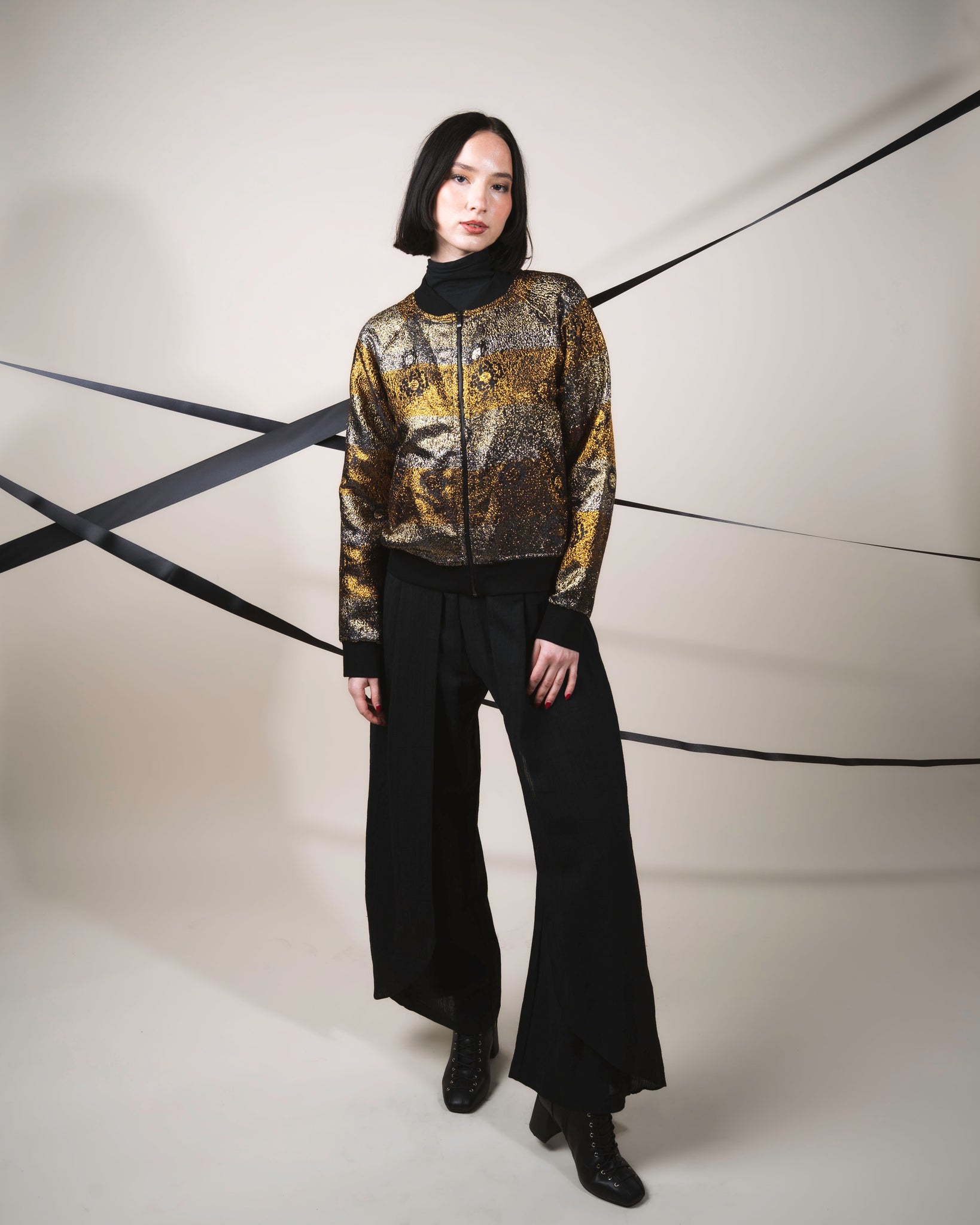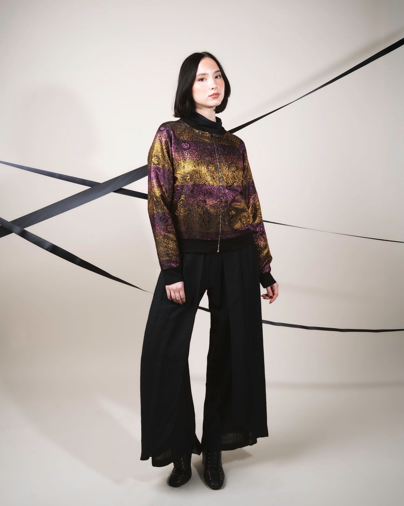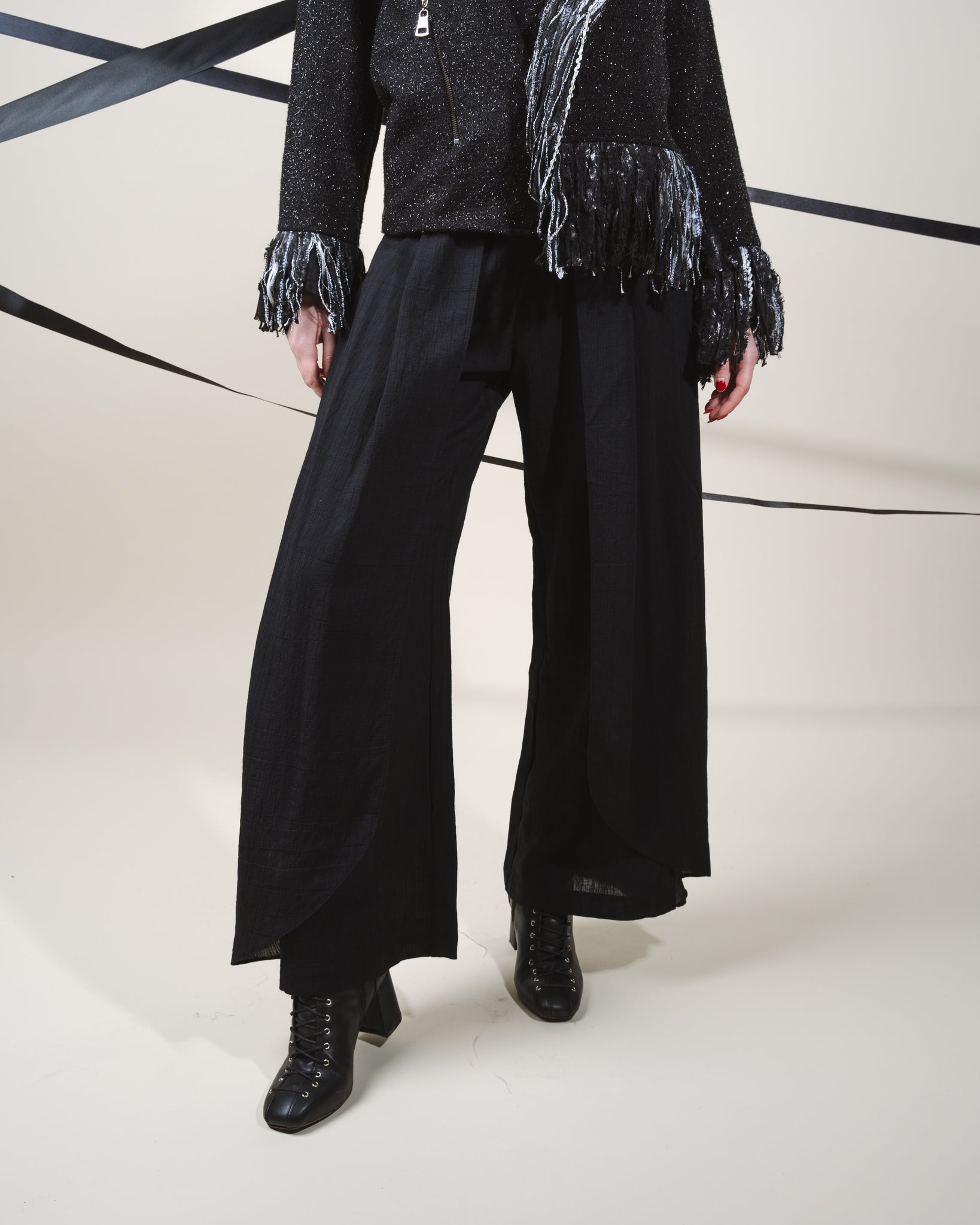 The Lavinia Trousers - Black have straight legs enhanced by the playful pleats. Flow and movement merged all in one design. Reworked formal trousers showcase Boo’s exploration of splicing. Mid High Waist. Tailored from a lightweight viscose. Pair them with a sleek blouse and heels for a polished look, or opt for a casual vibe with a fitted tank top and sandals. The versatility of Lavinia Trousers ensures they can easily transition from a chic urban look to a relaxed weekend ensemble.
